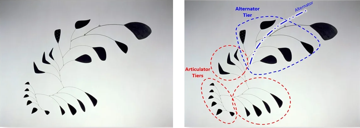 Conversely, if the arrangement orients the arms around a centerline, then the tier is known as an Alternator. The Cg of this style is more or less fixed – but is subject to the centerline inclination (if it is not vertical). These tiers tend to gyrate around the central connection point.