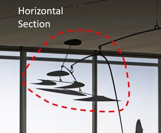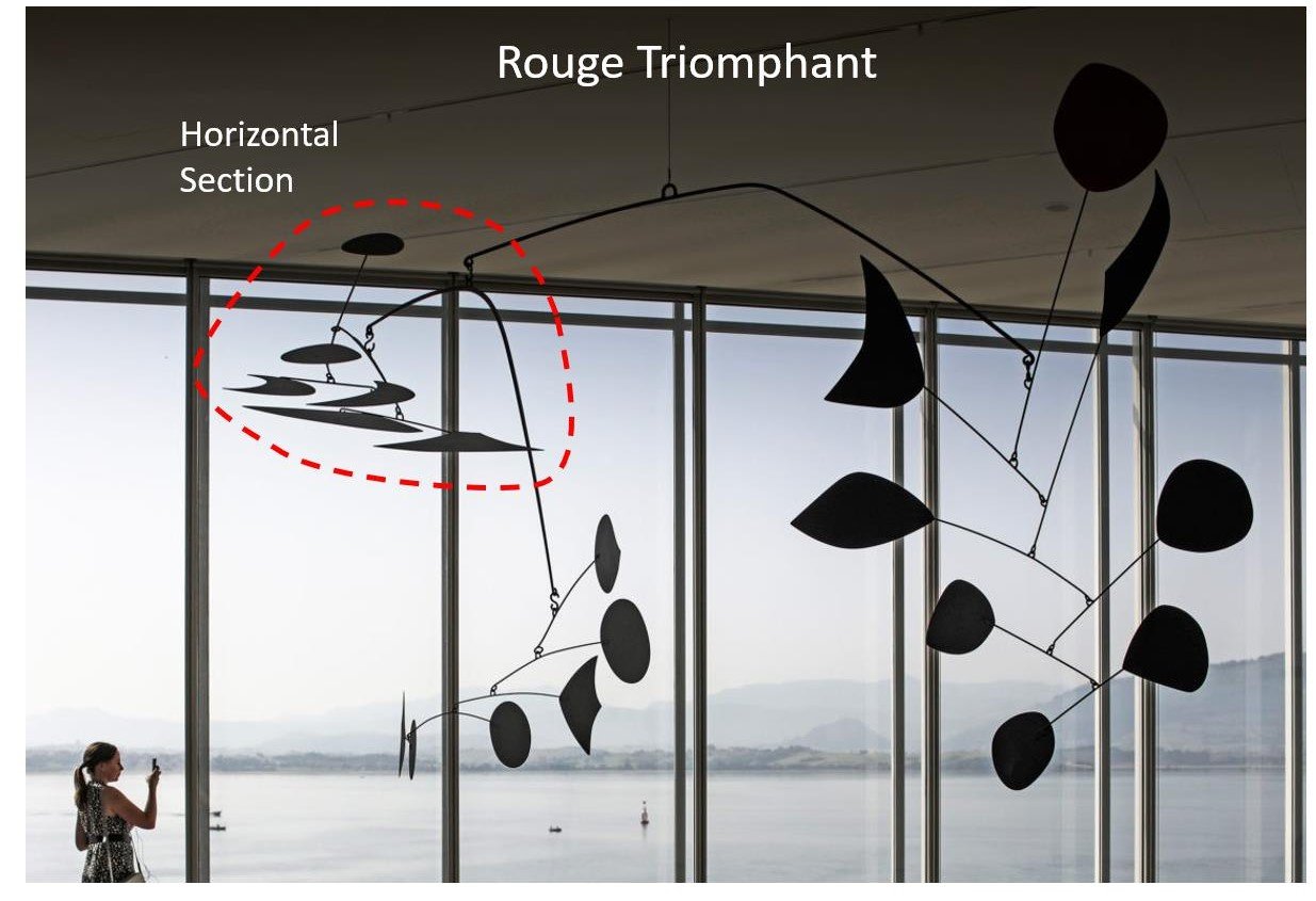 The blades in the Vertical Foliage mobile by Calder (above) are all arranged “vertically”. You can see the distinction from his Rouge Triomphant “horizontal” section. He often made horizontal shapes appear aeronautical, teasing the similarity with bird-like shapes. They absolutely transport you when viewed up-close.