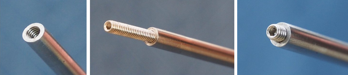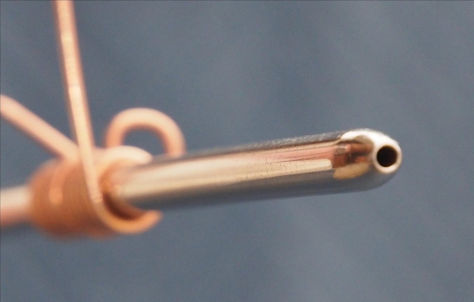 The arm is a hollow tube that is threaded at the ring interface and bullet-nosed at the other end. The ID of the branch arm is closely matched to the wire OD. The hook itself is made from hard-temper Phosphor Bronze wire that extends as much of the full length of the tube as possible.