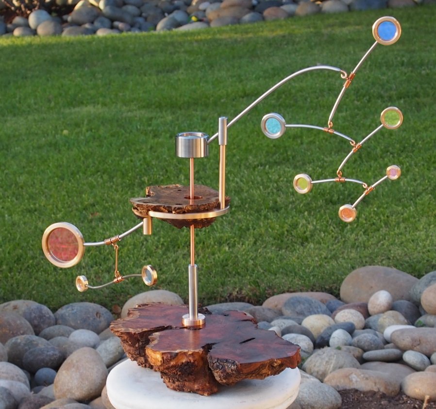 I crafted my first standing mobile in 2010 and quickly realized the opportunity that this style of mobile offered. A table-top sized piece would be an ideal volume to design towards as it provides the ability to track the sun through seasonal changes.