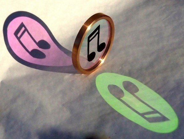 Here is a picture of a single optic with a graphic affixed to one surface of the dichroic. You can see the transmitted light on the left is magenta and the reflection is green. The same optic is then tilted slightly with respect to the sun. The lower photo shows the transmitted light is now green and the reflection is purple.