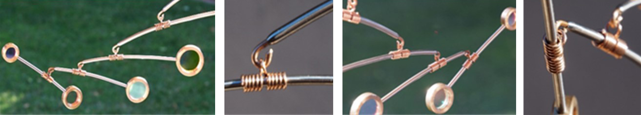 Key to the arm is its Center-of-gravity, Cg or balance point, around which most attachments are made. A simple loop, bent into the rod is what Calder and most makers do at this location on the arm.
