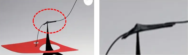 Admittedly, some weld an attachment loop for the next section of the tier, but the net effect is identical: a fulcrum position has been defined by the loop. When using this loop, if the angle of the arm is incorrect, it can be adjusted by adding or subtracting mass at the blade end. It would make sense for Calder to loop a large rod, attach a slightly-too-large blade mass to it, witness its angle of balance and then grind off metal until the proper repose was attained. Or punch a hole in the blade.