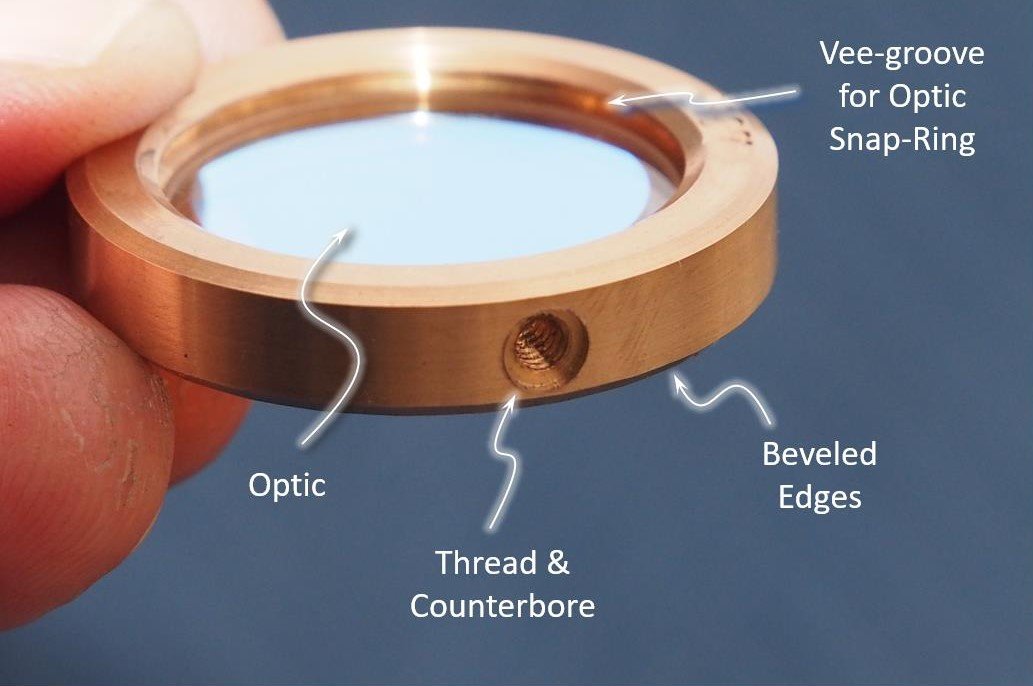 The depth of this CB is dictated by the thickness of the optic. A snap-ring made from spring-temper phosphor bronze is used to secure the reflector in place. The snap ring is captured in the ring by a small internal vee-groove machined at the top of the optic counter-bore.